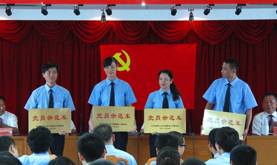 党委副书记袁杏娣主持会议,对2010年以来的党建工作进行了总结。大会表彰了一批党内的 “优秀共产党员”、“优秀党务工作者”和“优秀党组织”,并对首批4辆“党员示范车”进行命名授牌。被评为市优秀共产党员的“党员示范车”代表张娅瑛作了表态发言,党员代表朱立明作了创先争优倡议。最后,总经理、党委书记蔡健臣以“三件大事、三个转变”为统领,回顾了建党90周年的历史以及常州公交在党的领导下近年来发展的成就,并对党建工作提出了三点要求:一是认清当前形势,凝心聚力谋发展,要坚持以人为本的价值取向、社会责任的发展理念、人才强企的发展战略、创先争优的党建思路;二是提升党建水平,积极探索求创新,要在工作思路、活动方式、工作机制上创新;三是发挥先锋作用,奋勇争先重实践,要在推进企业发展、本职岗位、转变作风中创先争优。