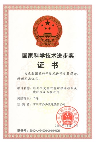 由东南大学交通学院牵头,常州市公共交通集团公司等单位参与的“地面公交高效能组织与控制关键技术及工程应用”项目荣获2012年度国家科学技术进步奖二等奖,这是常州公交首次荣获国务院颁发的国家科学技术进步奖。