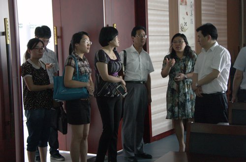 图为集团公司党委书记袁杏娣带领省、市政研会领导参观常州公交道德讲堂会场