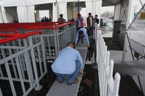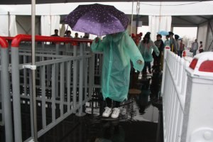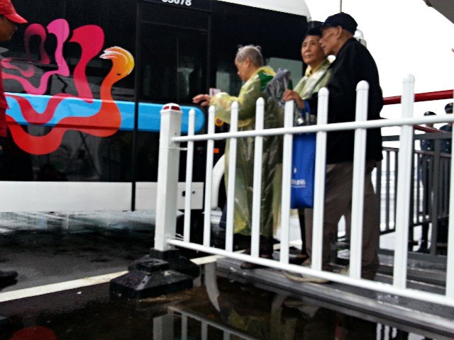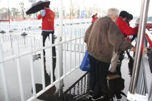 昨天,受台风影响常州下起了大雨,使设置在花博会P1停车场内的公交专线蛇形护栏通道内积起了许多雨水,给游客乘车带来了麻烦。常州公交立即组织人员到现场进行勘察,丈量尺寸,安排人员加班加点赶制。今天凌晨1点,几块安全牢固而又美观的过水“跳板”制作而成,乘客坐车再也不用担心湿鞋了。