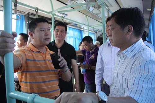 在BRT车上,公司副总经理吴强介绍了公司发展情况和BRT运营情况,并就领导们提出的上下班客流高峰和安全乘车问题等问题进行了详细汇报。客流高峰期,在充分利用BRT专用道和信号优先系统保障公交快速通行的同时,加大运能投放,并安排站服人员做好乘车引导、秩序维持,驾乘人员加大对乘客携带危险品行为的劝阻,保障乘客安全。
