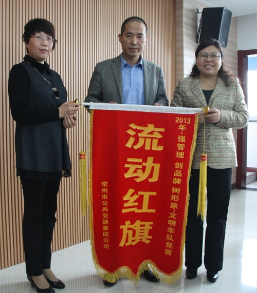 集团公司党委书记袁杏娣、工会主席王琦为受表彰车队授旗。(营运发展部 何鹏)