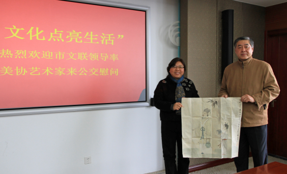 荣主席表示,常州公交是我市的一张靓丽的名片,也是全国公交战线的排头兵,让常州市民引以为豪,公交一线职工常年辛勤工作,为市民提供了安全、便捷、优质的服务,此次送书画到公交,是表达文艺工作者对公交职工的一份敬意和感谢。