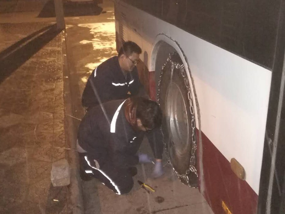 张军所在的501车队共有3条公交线路,86辆公交车,平时配备了两名场站小修,两人轮班,平均每人每天工作8小时。一周前同事生病请假,平时两人的活,现在都是张军一人顶下来。20日下雪,张军的工作强度就更大了,“19日就接到公司通知,说接下来几天可能有大雪天气,所以20日起就提前半小时上班(凌晨4点半)。”20日,张军一直忙到晚上9点,临下班前,还为两个200斤的车胎绑上了防滑链。连续1周多满负荷工作,张军的嗓子也有些哑了。即便是晚上回去休息时,他的手机也是开机状态,随时待命。