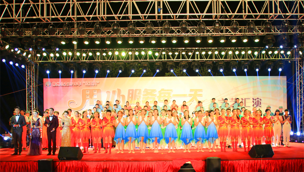 5月19日晚上,以“用心服务每一天”为主题的常州公交2016年 “红五月”职工文艺汇演在新建的礼河公交枢纽精彩上演。市交通运输局党委书记戴明水、党委副书记杨纪平、市总工会专职委员王俊岚、91079部队政委姜祖明以及拉萨公交、哈尔滨公交、南京江南公交等多位领导与公交500多名干部职工、省城建校学生、共建部队官兵一起观看了演出。