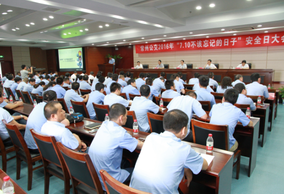 7月8日,常州公交集团公司召开2016年“7•10不该忘记的日子”安全日大会,深入分析典型事故,再次敲响行车安全警钟,铭记事故惨痛教训,提升安全责任意识,积极做好本质安全。市交通运输局专职委员黄开军,安监处处长吴琪中,集团公司领导、队科级以上干部,全体安管人员、驾驶员代表200余人参加会议。会议由集团公司副总经理丁瑜主持。
