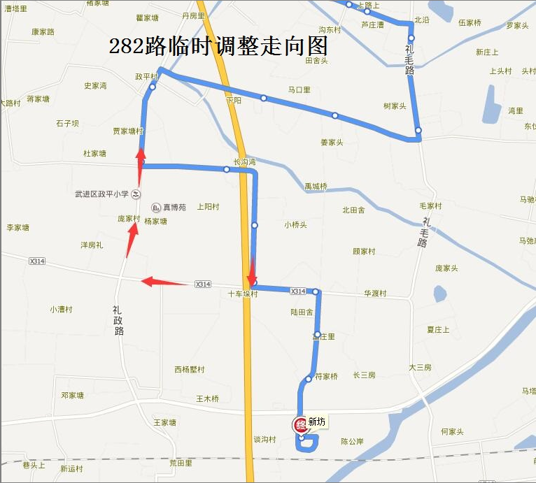 282路:由礼嘉公交中心站始发,按原线行驶至十车垛桥站后顺时针环绕前南公路、礼政路后返回。临时撤销前南公路(上阳线—谈沟线)、谈沟线行驶路段;同步撤销“上阳桥”西行、“上阳村、十车垛桥”北行停靠站,“陆田舍、小元里、淡沟村”双向停靠站及“新坊”终点站。绕行路段新增“政平小学”北行临时停靠站。