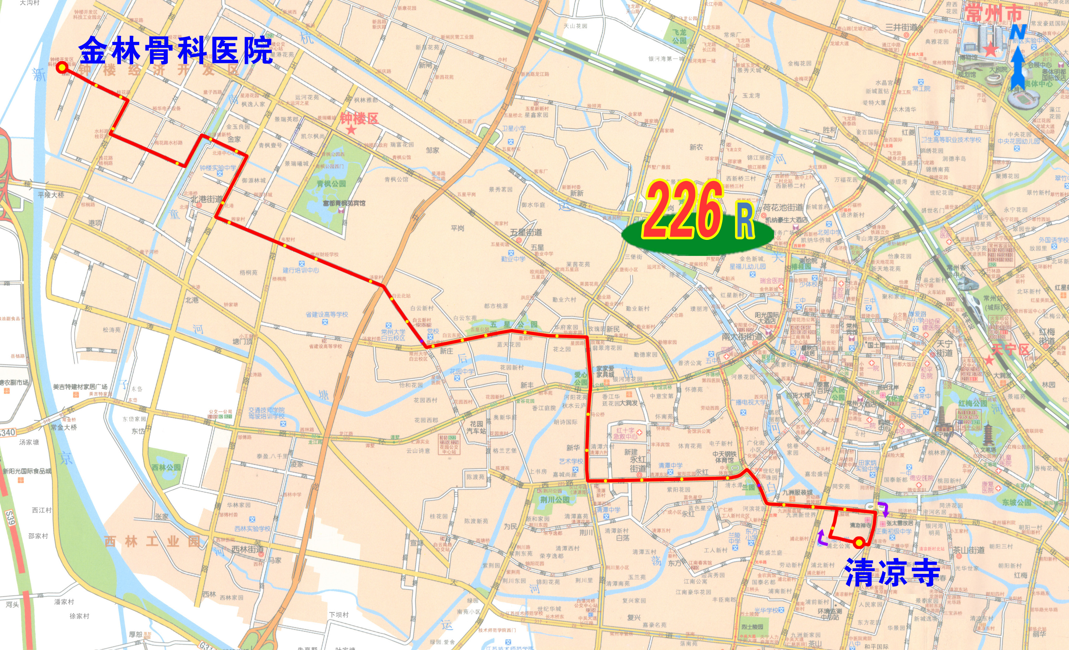 新辟226路:由金林骨科医院始发,经合欢路、桂花路、水杉路、合欢路、玉龙南路、梧桐路、白云路、星园路、长江中路、清潭路、劳动西路、和平路、清凉路至清凉寺返回。沿途停靠金林骨科医院、合欢路樱花路、合欢路桂花路、桂花路水杉路、水杉路童子河西路(新能源吻合器厂)、北港建新桥、钟楼实验小学、玉龙路水杉路、梧桐路玉龙路、梧桐路茶花路、常州财经学校、汤家村、白云北站、白云新村、常州党校、白云东苑、五星公园、星园桥、华府家园、长江路怀德路、清潭六村、清潭新村(激光医院)、清潭东站(永红医院)、紫阳花园、中天体育馆、九洲服装城、九洲数码城、常州电脑城、清凉寺等站。