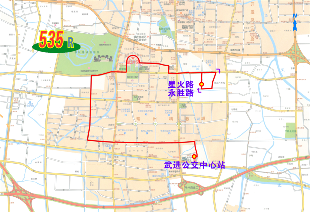 535路:由武进公交中心站始发,经站北路、新平路、鸣新路、凤林路、延政大道、环府路、府东路、永安路、延政大道、火炬路、永胜路、星火路至星火路永胜路返回。沿途停靠武进公交中心站、鸣新路新平路、名仕佳园、机电学院、鸣新路兰陵路、鸣凰北、鸣凰小学、凤林路鸣新路、凤林路科创路、凤林路晓柳路、晓柳花苑、延政大道凤林路、延政大道兰陵路、武进建设局东门、武进区政府北门、府东路花园街、府东路梅园路、永安路府东路、御城南门、延政大道星火路、火炬路延政大道、永胜路火炬路、星火路永胜路等站。