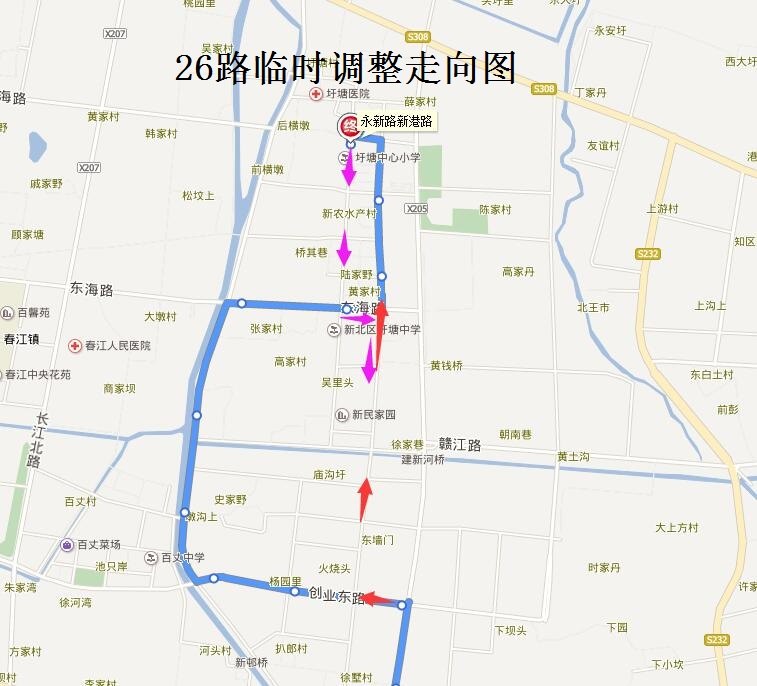 26路:由常州北站始发,按原线路行驶至创业路盛业路路口后,调整行驶盛业路至东海路路 口按原线行驶至永新路东海路路口后由盛业路返回。撤销创业路(盛业路—东圩路)、东圩路(创业路—东海路)、东海路(东圩路—永新路)行驶路段,同步撤销“百丈工业园、盛扬桥、百丈东、圩塘康乐中心、大墩桥”双向停靠站及“东海路永新路”东行临时停靠站,调整行驶路段增设“新业花苑”双向临时停靠站。