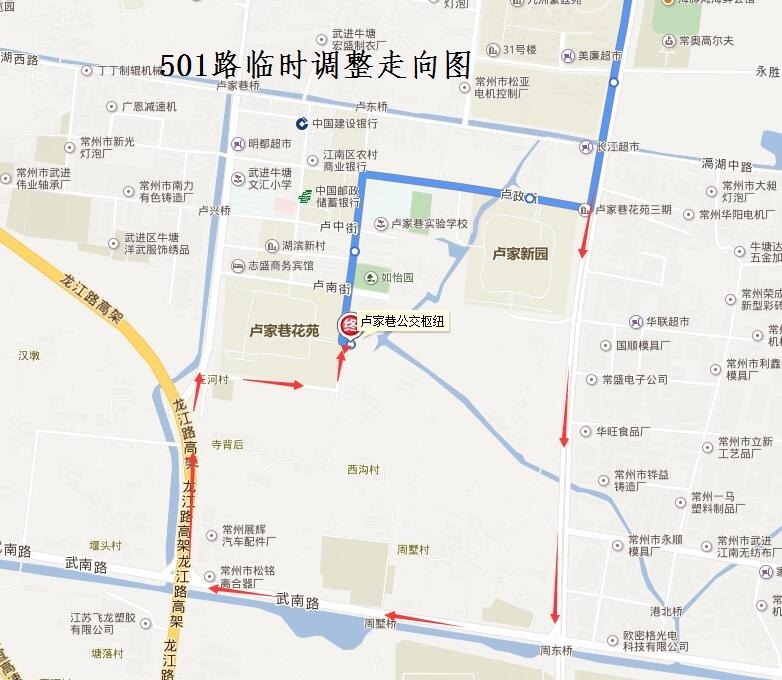 501路:由阳湖广场始发,按原线路行驶至长江路卢政街路口后,调整行驶长江路、武南路、龙江路、湖滨路、科创路、东桥南路至卢家巷公交枢纽返回。临时撤销卢政街(长江路—东桥南路)、东桥南路(卢政街—卢南街)行驶路段,同步撤销“卢家新园、卢家巷幼儿园”双向停靠站;调整行驶路段增设“卢家新园东、港东桥、周墅桥、武南路湖滨路、三河村委”双向临时停靠站。