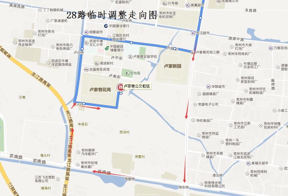 28路:由白荡河公交中心站始发,按原线路行驶至长江路卢政街路口后,调整行驶长江路、武南路、龙江路、湖滨路至科创路路口后恢复原路线行驶。临时撤销卢政街(长江路—湖滨路)、湖滨路(卢政街—科创路)行驶路段,同步撤销“卢家新园、卢政街东桥南路、卢兴桥”双向停靠站;调整行驶路段增设“卢家新园东、港东桥、周墅桥、武南路湖滨路”双向临时停靠站。