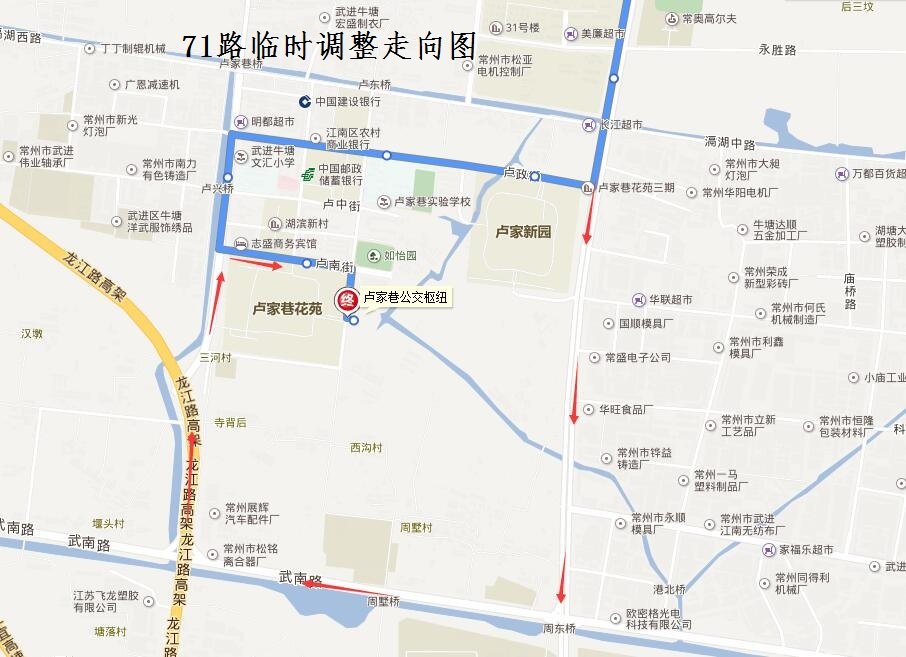 71路:由湖塘纺织城公交中心站始发,按原线路行驶至长江路卢政街路口后,调整行驶长江路、武南路、龙江路、湖滨路至卢南街路口后恢复原线行驶。临时撤销卢政街(长江路—湖滨路)、湖滨路(卢政街—卢南街)行驶路段,同步撤销“卢家新园、卢政街东桥南路、卢兴桥”双向停靠站;调整行驶路段增设“卢家新园东、港东桥、周墅桥、武南路湖滨路”双向临时停靠站。