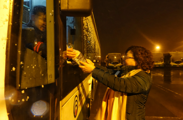 1月25日,大雪如期降临我市,给城市交通带来严峻考验。凌晨,公交人就忙碌起来,清扫车上积雪、热车、检查车辆机务状况、做好发车前的各项例保工作……尽管天气寒冷,但大家的心里却是暖暖的。走进站房,一份有热牛奶和面包的爱心早餐已经准备到位了,发放给每位驾驶员、修理工。吃完早餐,大家又赶紧投入到紧张的运营中了。“后面还有降雪、降温双重考验,我们一刻都不能停下来。” 一些拿到爱心早餐的驾驶员道,“这个冬天,有了企业的认可、关爱,工作虽然辛苦,但心里都是甜甜的。