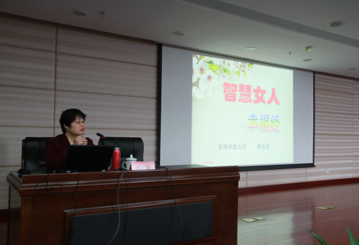 常州开放大学“金牌讲师”董农美副教授受邀,带来了《智慧女人幸福经》的精彩解读。董教授从自我认知、亲子教育、夫妻关系、人际沟通、家庭氛围、自我提升等方面,与大家分享了9条“智慧女人幸福经”。生动的语言,丰富的案例,董教授精彩的讲课说进了大家的心坎里,赢得了阵阵掌声。