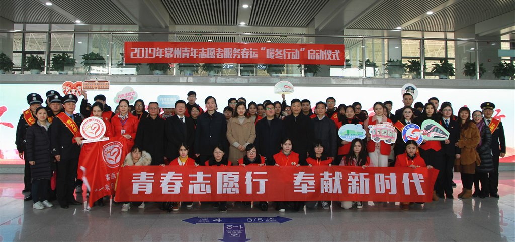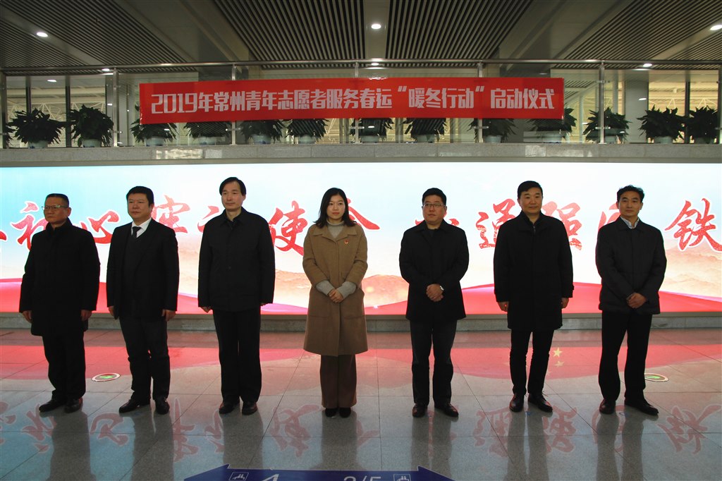 1月21日是2019年春运的第一天。为深入贯彻落实党的十九大精神和习近平新时代中国特色社会主义思想,弘扬青年社会正能量。上午9点,常州公交青年志愿者和交通系统其他单位团组织成员齐聚在常州站焕然一新的候车室内,参加了2019年“暖冬行动”春运志愿服务活动启动仪式。团市委副书记刘团,市交通运输局副局长曹建中,公交集团党委副书记、总经理吴强等春运相关运营单位负责同志出席了启动仪式。