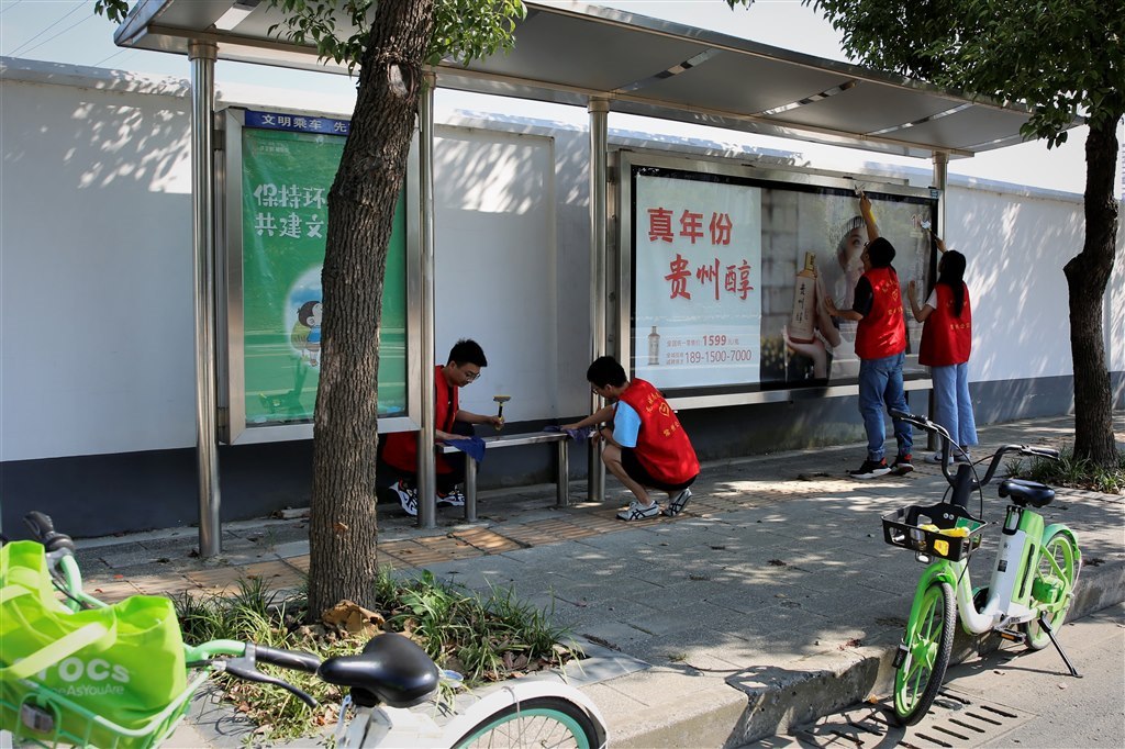 擦靓公交站牌迎国庆 助力绿色出行践文明